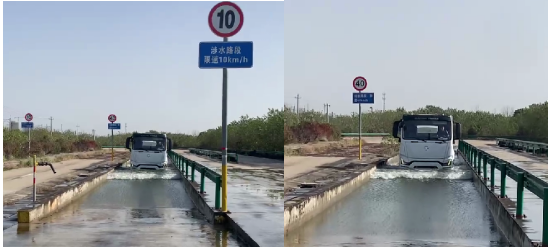 将车辆以前进挡起步进入水池后,缓慢加速**(8±3)km/h 的目标车速后保持匀速行驶直**驶出水池。再将车辆以倒车挡起步进入水池后,缓慢加速**(8±3)km/h 的目标车速后保持匀速行驶直**驶出水池。从车辆达到目标车速时开始计时,直**车辆在500mm 深的蓄水池中累计行驶 10 分钟后试验结束。